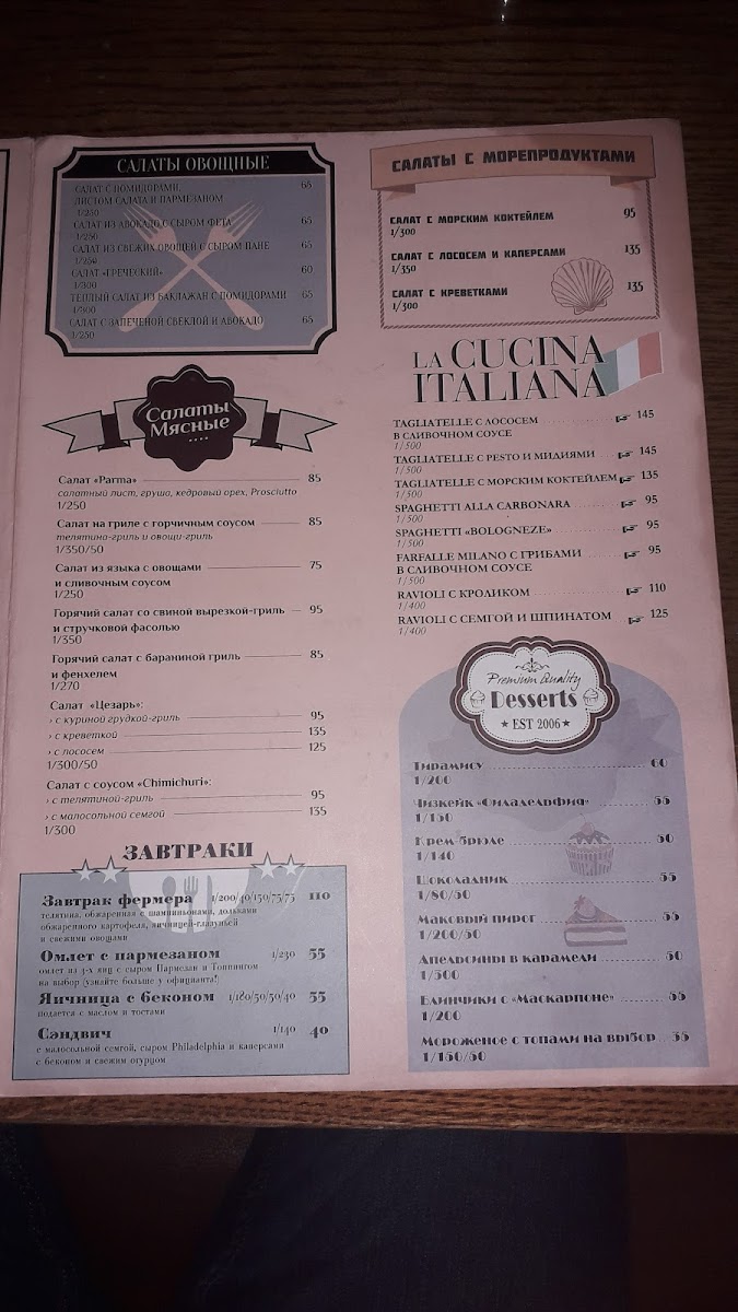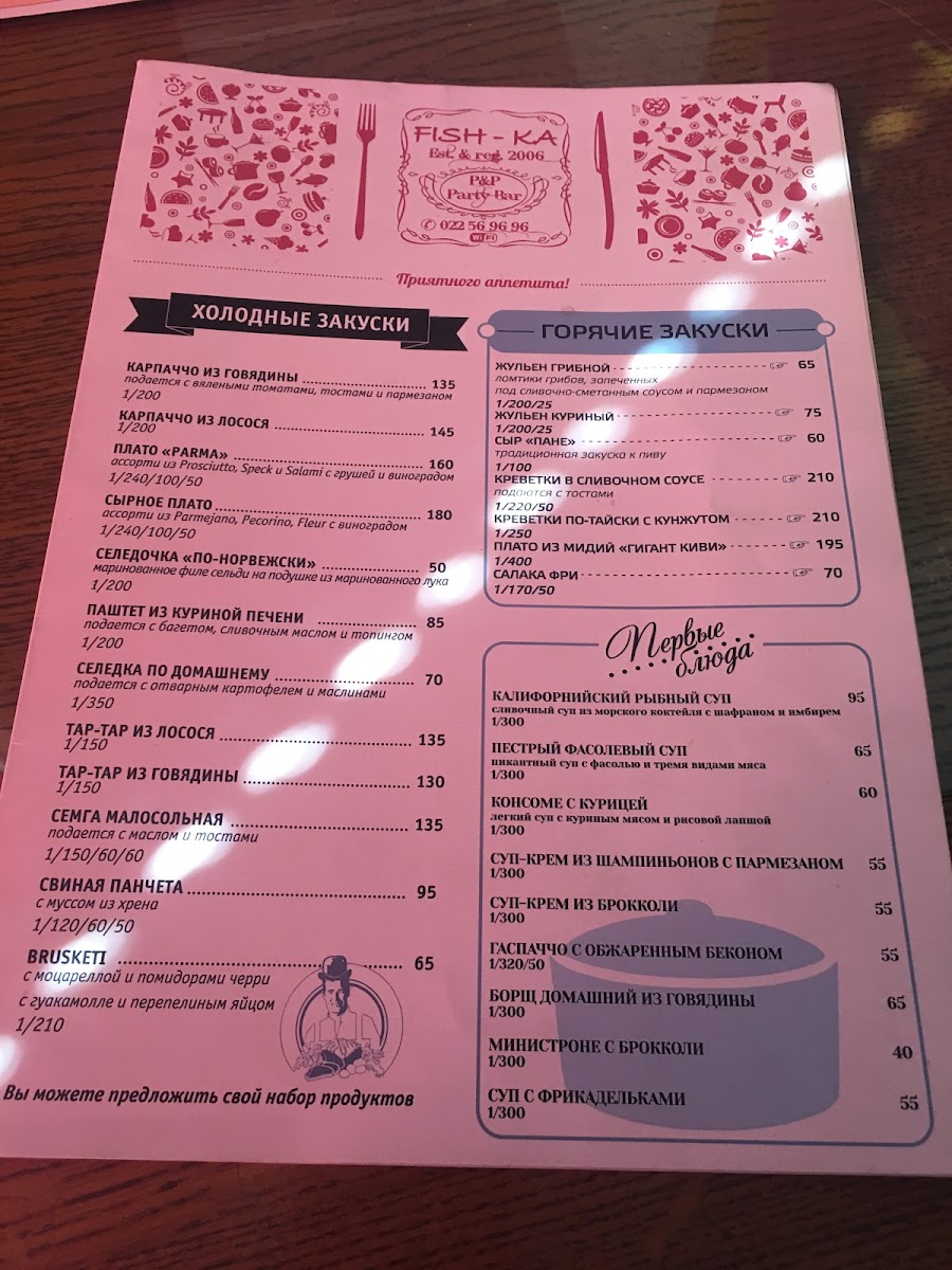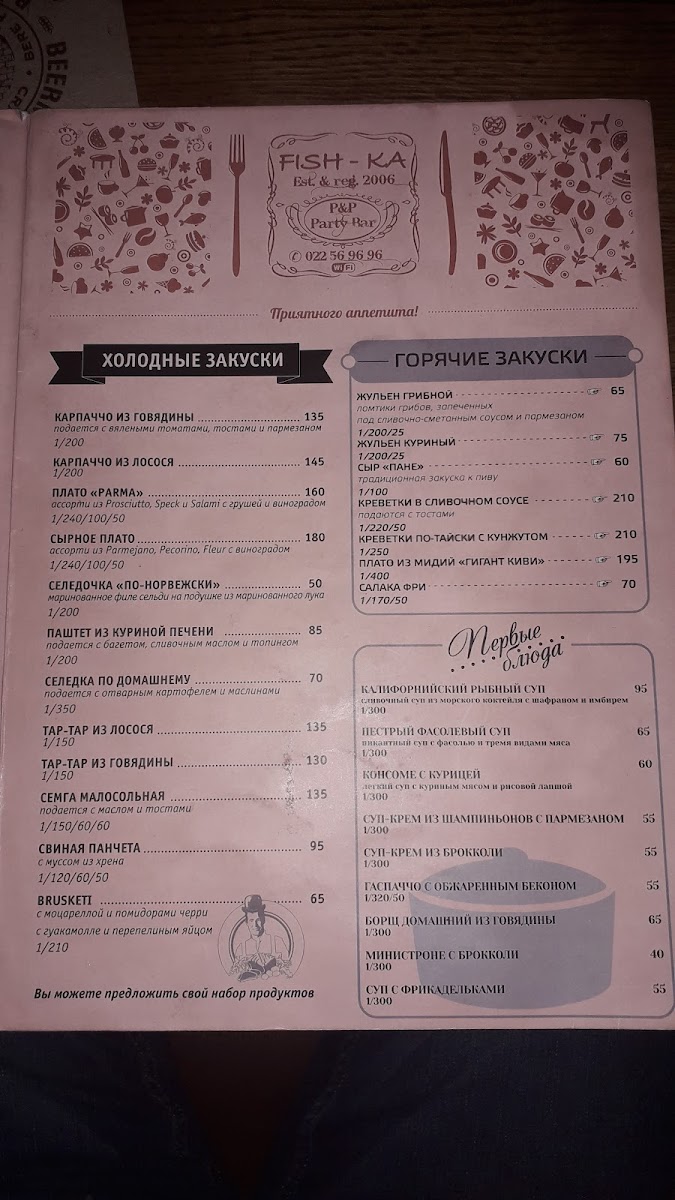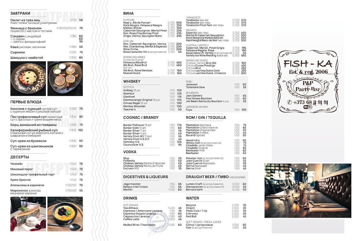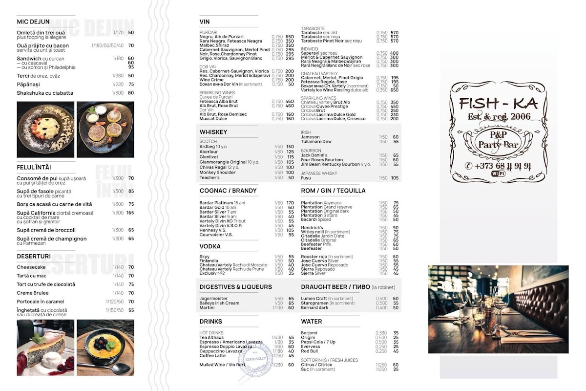 The menu at Fish-Ka in Chișinău leaves a clear impression of balance and versatility, combining comforting classics with well-chosen drinks that round out the dining experience. On the savory side, Carbonara Pasta stands out as a dependable favorite, rich and satisfying, offering the kind of creamy, hearty flavor that appeals to both casual diners and those looking for something filling yet familiar. For a more robust option, Рёбрышки Гриль deliver a bold, grilled character, making them an appealing choice for guests who prefer meat-forward dishes with depth and intensity. Meanwhile, Shakshuka Cu Ciabatta adds variety to the menu with its warm, spiced profile and rustic presentation, pairing beautifully with fresh bread and providing a lighter yet flavorful alternative. The beverage selection complements the food menu well, moving smoothly from coffee to cocktails. Espresso Doppio Lavazza offers a strong, aromatic finish for those who appreciate a classic Italian-style coffee, while Капучино provides a smoother, creamier option suitable for relaxed moments during or after the meal. For guests in the mood for something stronger, Long Island Tea brings a familiar cocktail choice that fits naturally into the overall menu without overshadowing the food. Taken together, these highlighted items show a menu designed to cater to different tastes and occasions, emphasizing comfort, consistency, and a thoughtful mix of food and drink that completes the overall dining experience.